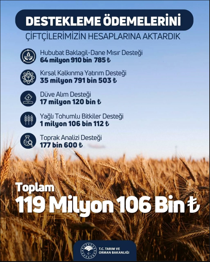 Bakanlık tarafından yapılan açıklamaya göre, toplamda 119 milyon 106 bin liralık destekleme ödemesi çiftçilerin hesaplarına aktarıldı. Bu ödemeler, çiftçilerin mali yüklerini hafifletmek ve tarımsal üretimi desteklemek amacıyla yapıldı.